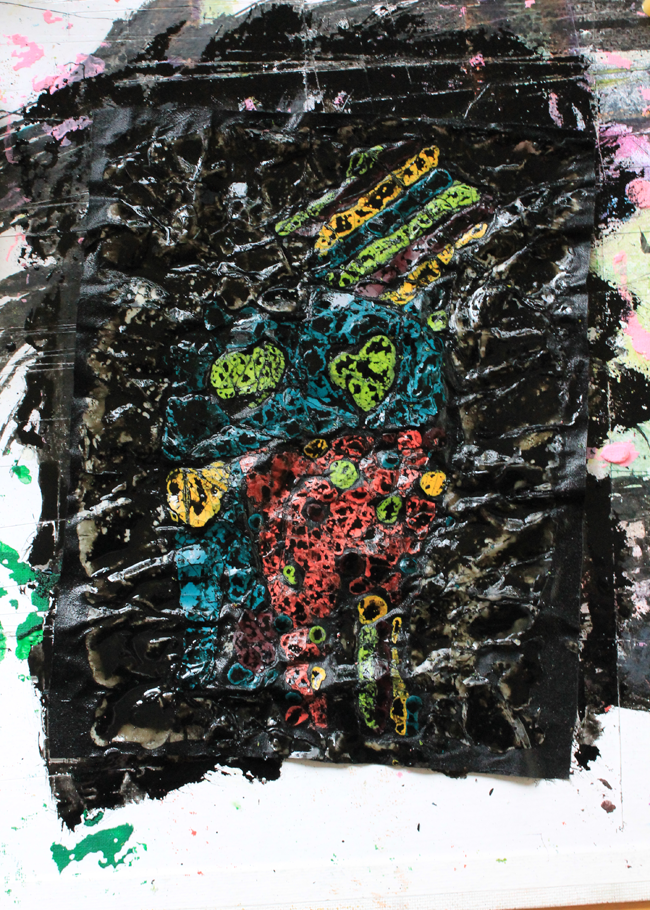 I have to melt wax and my pigments. Half the trick is working quickly enough to get the wax to fully penetrate the fibers, otherwise I end up with big black splotches of ink in the finished product (which you might notice in the above piece).